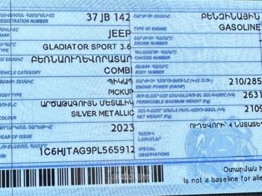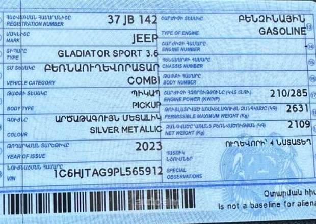 Վաճառվում է Jeep Gladiator Sport, 2023 թվականի արտադրության [ blocked ] կիլոմետր վազքով։ Ավտոմեքենան արծաթագույն է, ԱՄՆ-ում ունեցել է երկու սեփականատեր։ Շարժիչի ծավալը՝ 3.6 լ, շարժիչի տեսակը՝ բենզին։ Փոխանցման տուփը՝ ավտոմատ, քարշակը՝ լիաքարշակ (4x4)։