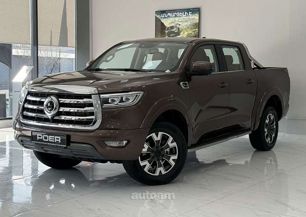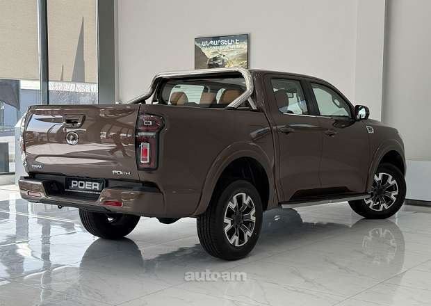 GWM POER հզոր և հուսալի փիքափ՝ 2.0L տուրբո դիզել շարժիչով, 8-աստիճան փոխանցման տուփով և հենասահքային թափքով։ Գետնից բարձրությունը՝ 227 մմ, ծանրաբեռնվածությունը՝ մինչև 900 կգ, ծախսը՝ 9.4 լ/100 կմ։ Հագեցած է CarPlay, ադապտիվ կրուիզ կոնտրոլով, ավտոմատ արգելակման, գոտին պահելու և նշանների ճանաչման համակարգերով, 360° տեսախցիկով ու առանց բանալի մուտքով։ Պաշտոնական երաշխիք՝ 3 տարի կամ 100,000 կմ։